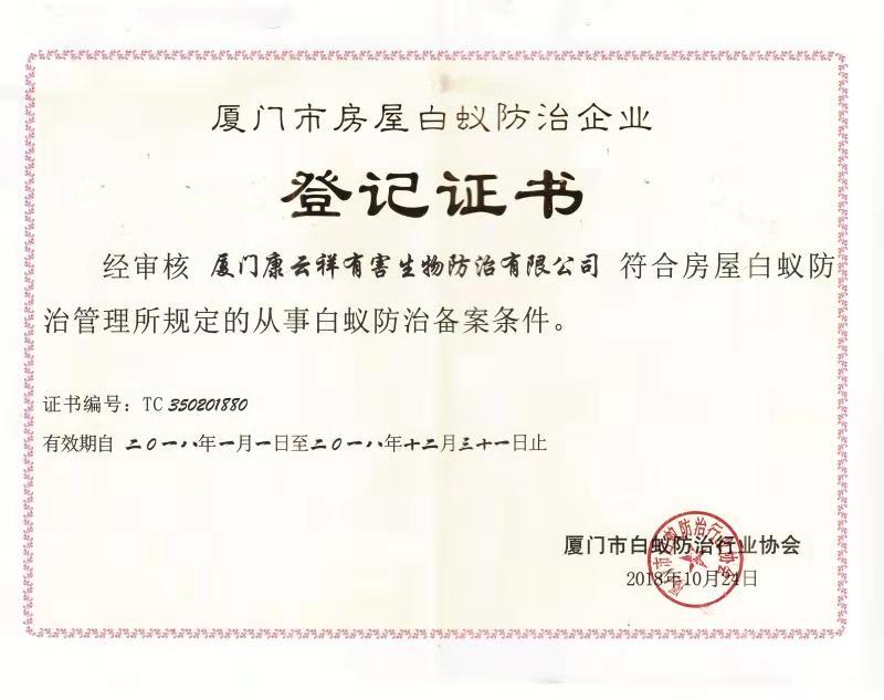 廈門康云祥有害生物防治有限公司是2010年經廈門市工商局注冊、市衛生局愛衛辦《廈門市除四害管理辦法》的要求已備案的專業除四害消殺公司,是具備白蟻防治資質,證書編號:350201880的專業白蟻防治單位, 是衛生有害生物防制協會會員單位,是專門從事房屋白蟻預防,單位及家庭白蟻綜合治理,土建白蟻預防,裝修白蟻預防,古樹園林綠化廠房白蟻治理與四害